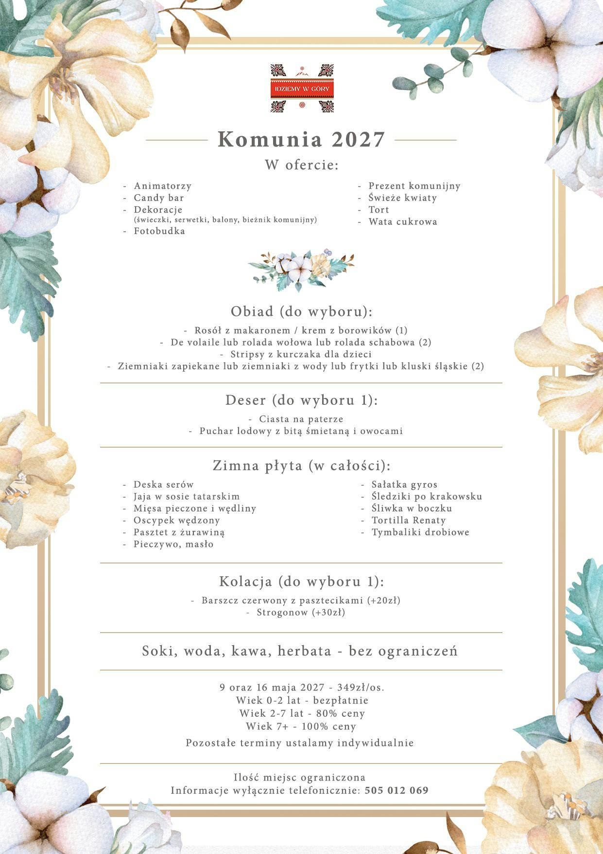 Z przyjemnością zapraszamy Państwa do wspólnego świętowania Pierwszej Komunii Świętej Waszych dzieci w naszej restauracji w 2027 roku. To dla nas ogromna radość móc towarzyszyć rodzinom w tak ważnym dniu.